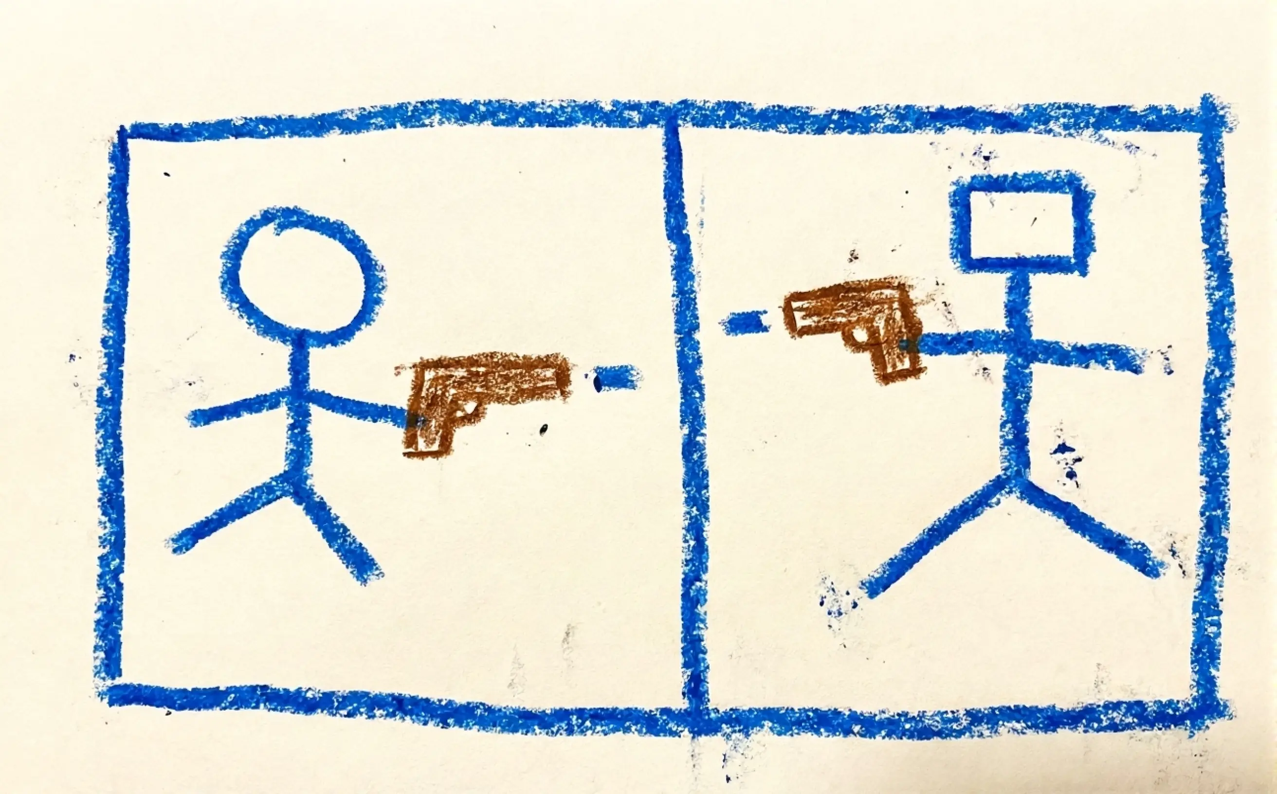 Flip book pages to build a soldier, get a gun, and shoot your opponent's lives.